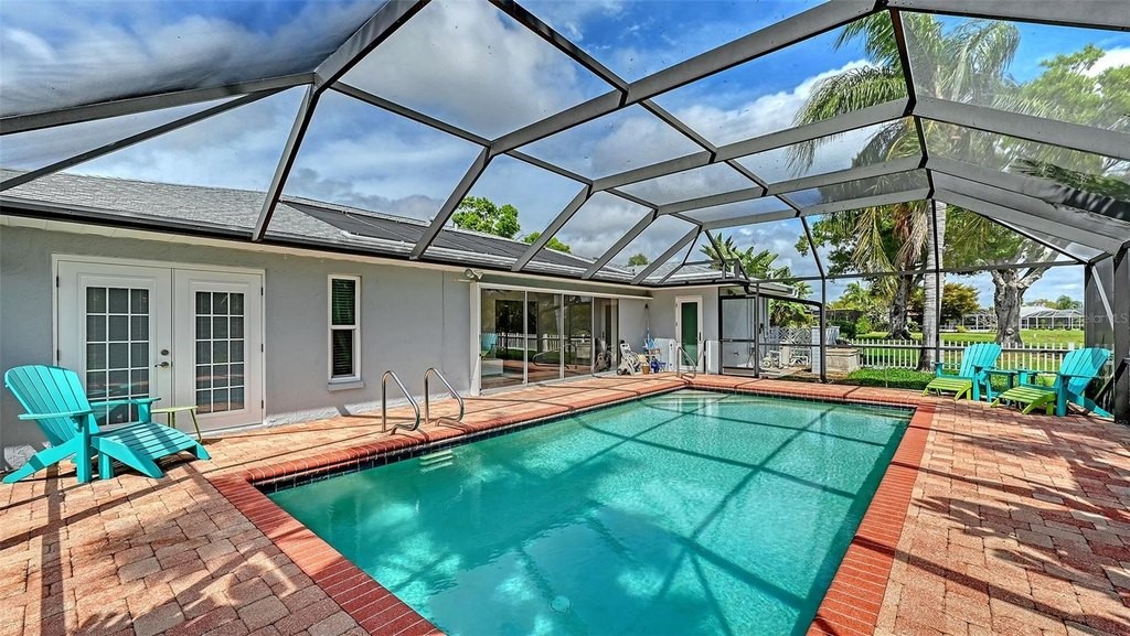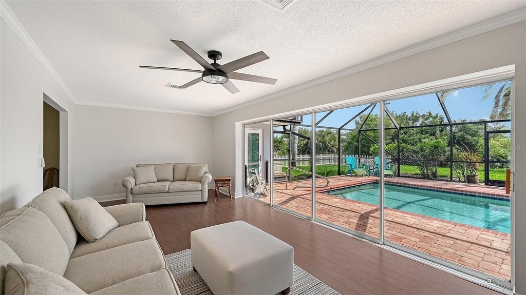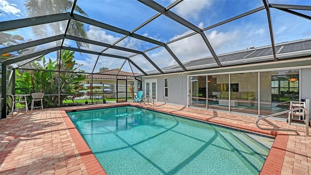 "What a great property, How did you find this?" is what everyone will be asking you when they visit you in this fantastic 3 bedroom, 3 bath, POOL home in the Jacaranda West area of Venice. This gem backs up to a green belt with water views of the pond almost next door. The home has numerous upgrades to include newer roof, A/C, & Hurricane Rated Windows. Most floors are done in engineered hardwood. A huge 11' X 26' Great Room / Florida Room runs along the back of the home, opening up through expansive sliders to a caged (28' X 40') Swimming Pool that measures approximately 14' X 28'. Outside by the Pool is a full bath with a 5' walk in shower. Come take a look at this value packed, exceptionally nice home today!